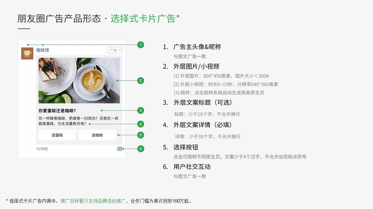 * 选择式卡片广告内测中,推广目标暂只支持品牌活动推广,合作门槛为单次投放100万起。