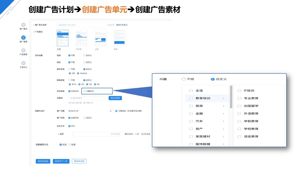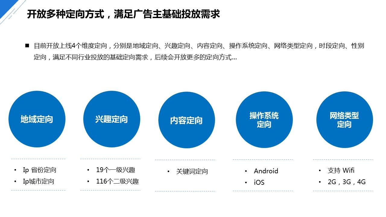 • 定向:性别、地域、操作系统、网络类型、兴趌定向、内容定向