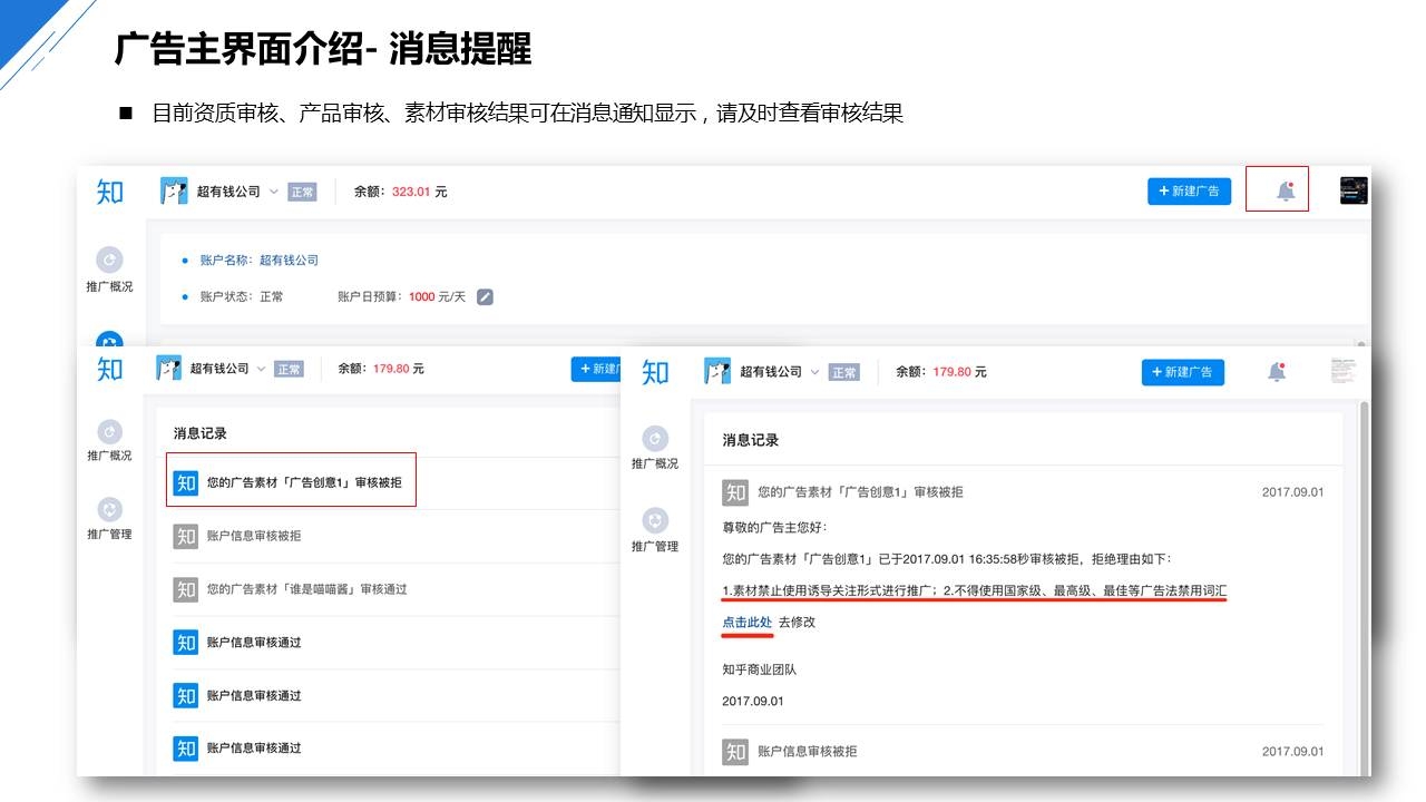 目前资质审核、产品审核、素材审核结果可在消息通知显示,请及时查看审核结