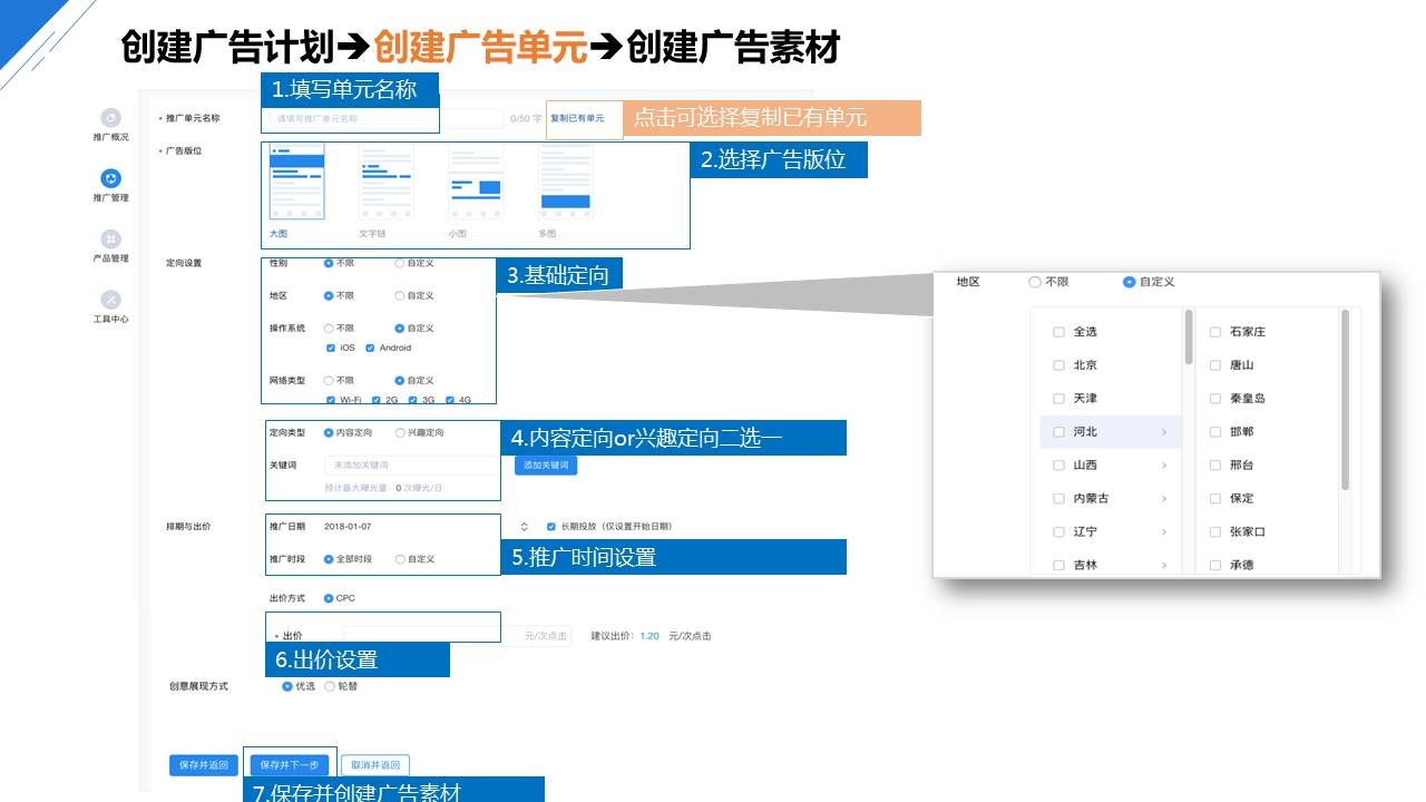 在单元页面,新建广告单元时,可对单元及单元内的素材进行复制操作
