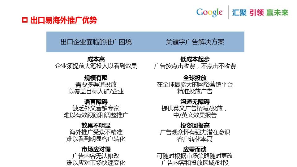 Google AdWords关键字广告出口易方案,是Google(谷歌)及其正式授权代理商为满意出口贸易企业谷歌海外推广需求而推出的英文关键字广告方案。