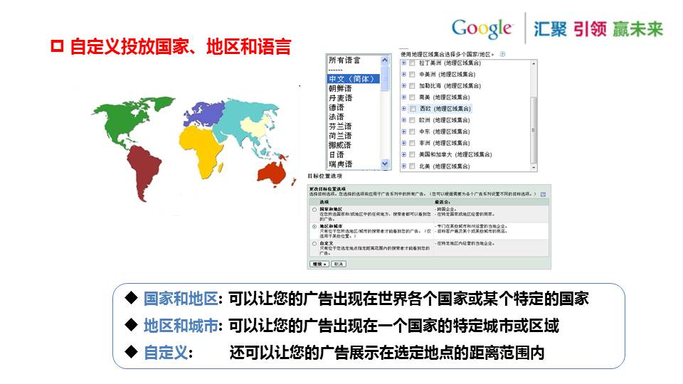 区域定位: 您能够挑选将广告投进到特定的200多个国家、区域甚至城市,也能够将广告投进到特定区域。