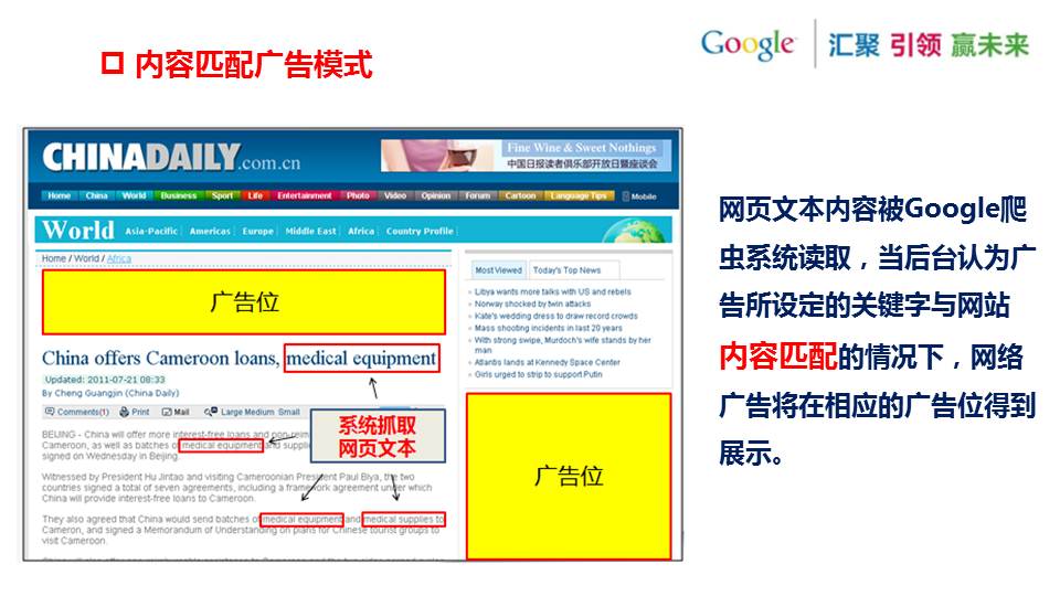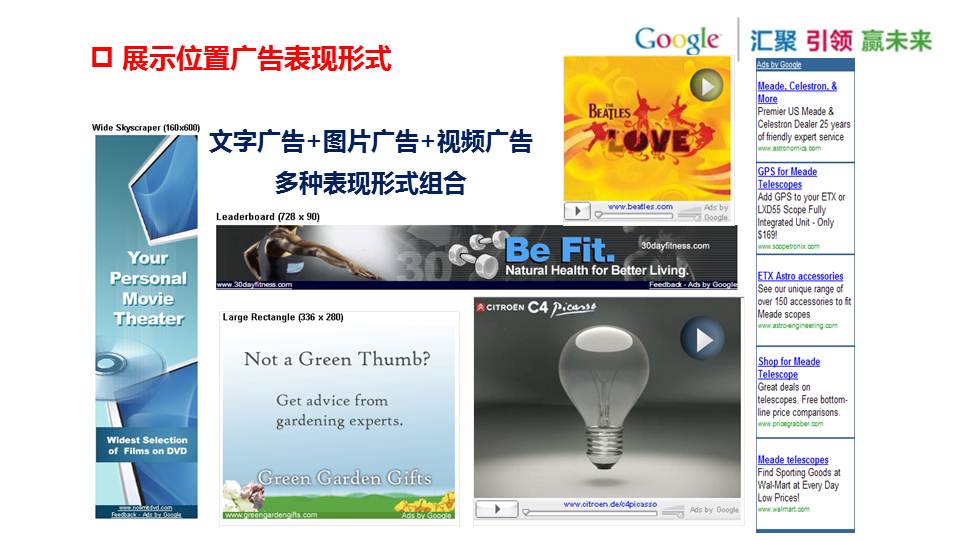 全方位的广告投进渠道:除了在Google查找成果页呈现外,您的广告还将展现在Google查找协作页、Google联盟网站页和其他Google产品上(Google AdSense广告)【“Google AdSense广告”做成超链接,指向“Google AdSense简介”】。