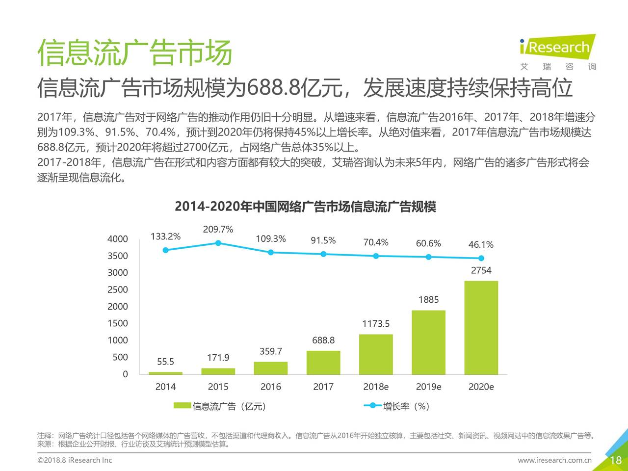 2017年中国信息流广告规模为688.8亿元,占总体网络广告份额的18.4%,份额跃居前三位。