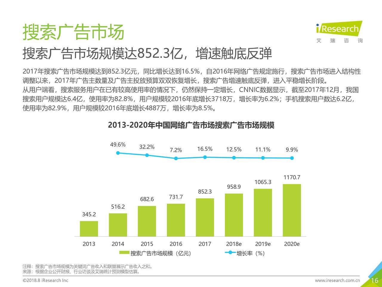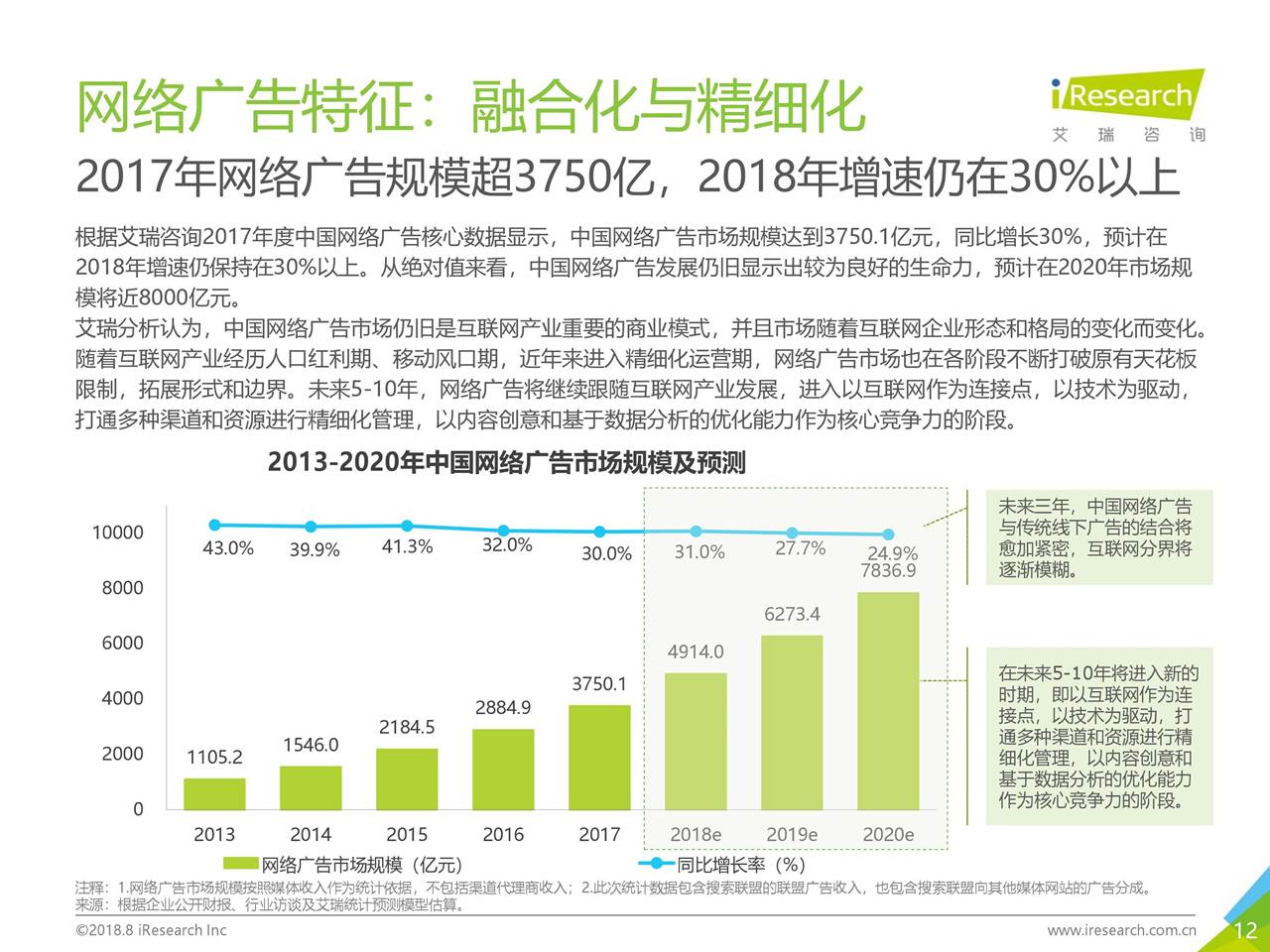 2017年度中国网络广告市场规模达到3750.1亿元,同比增长32.9%,未来两年市场规模仍保持较高水平,但增速将略缓,至2020年整体规模有望超过万亿元。