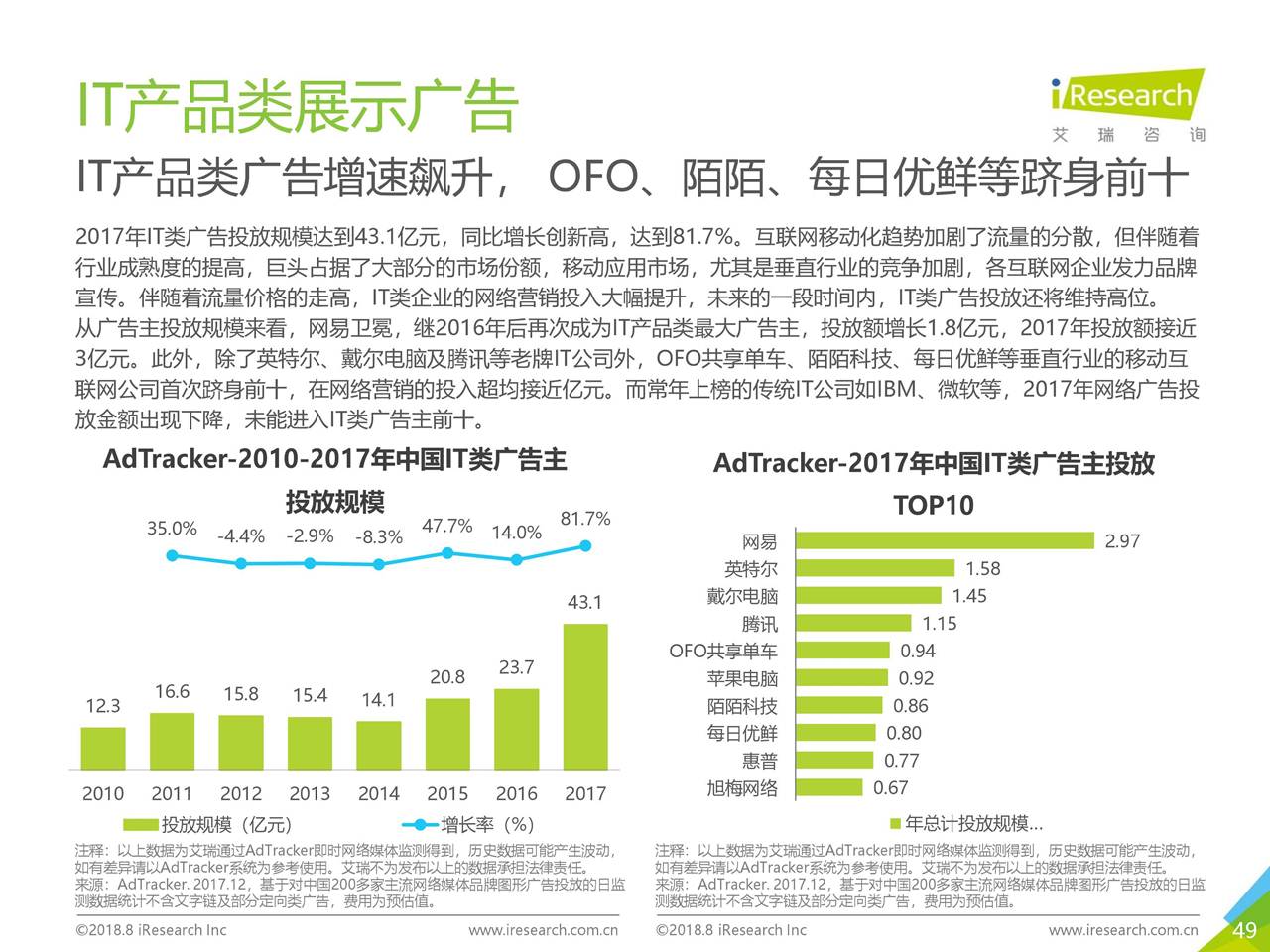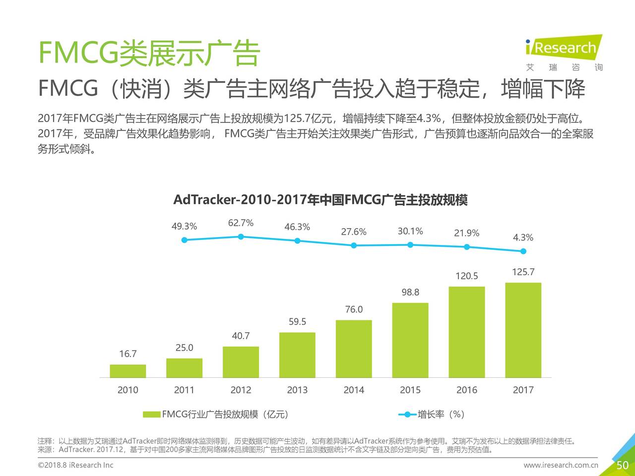 2017年FMCG类广告主在网络展示广告上投放规模为125.7亿元,增幅持续下降至4.3%,但整体投放金额