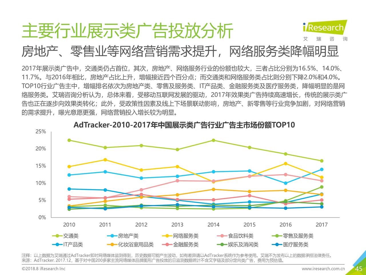 2017年展示类广告中,交通类仍占首位,占比为16.5%。其次,房地产、网络服务行业的份额也较大,二者占比分别为14.0%、