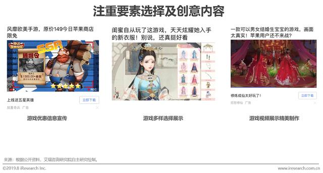 当前以“三国”、“江湖”、“倩女幽魂”等中国传统元素为主要背景的游戏产品对信息流认可程度较高,一方面,其游戏背景决定其广告素材与信息流内容差异性明显,因此可实现短时间内对用户注意力的吸引。另一方面也可看到,传统要素游戏对于用户的吸引,为其大规模进行广告投放创造了基础。游戏在文化传播方面的作用愈发明显。