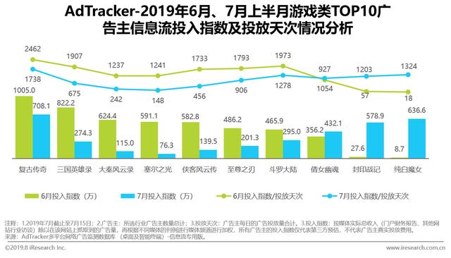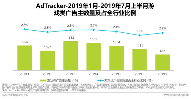 另外,基于2018年底广电宣布实行游戏发行版号管控,19年版号总数量将控制在3000以内,大大低于往年7000至8000个。游戏行业新产品发布速度缓慢,进而造成游戏广告主数量持续走低的现象。通过艾瑞AdTracker数据观察,3月峰值后,2019Q2广告主投放数量与行业投放比例持续走低。下半年,因7月为“假期效应”着陆期,仅7月上半月广告主数量占6月整月74%,预计7月整体游戏广告主行业投放占比有望破3%。
