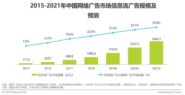 2018年信息流广告市场规模达到1090.4亿元,预计2020年将超过2500亿。信息流广告在中国网络广告细分领域的市场份额也不断攀升,2018年这一占比为22.5%,预计在2021年将达到35.8%。艾瑞分析,信息流广告具备原生性和精准触达的特点,较好地平衡了商业效果和用户体验,同时相对容易标准化和规模化。从长远角度,随着诸多广告形式向信息流的转化,信息流广告还有较大的增长空间。