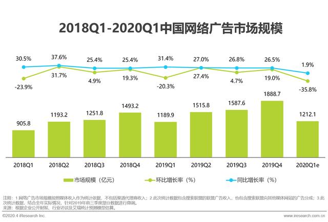 艾瑞:2020年Q1网络广告市场规模1212.1亿元,同比增长1.9%