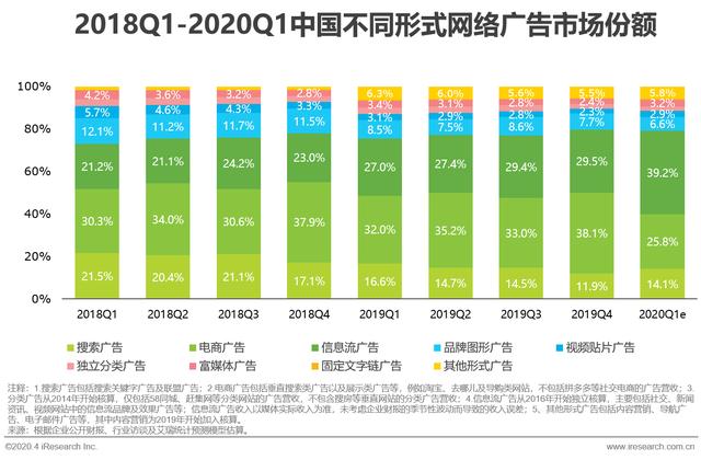 从2020Q1不同网络广告形式的市场规模变化来看,信息流广告份额的上升幅度明显,其中主要是由于短视频信息流广告的增长。疫情时期,用户对短视频内容的需求激增,进而推动短视频信息流广告库存和曝光的增加。同时,短视频信息流广告正处于高速发展期,而疫情创造的“宅经济”更是加速了广告主对于短视频营销价值的认可。除了信息流广告外,其它所有形式的规模均出现不同程度的同比下滑,因此造成份额的大幅波动,但随着疫情好转,未来网络广告不同形式的份额结构将重新回归到常态,尤其是电商广告的市场份额会有较大提升。